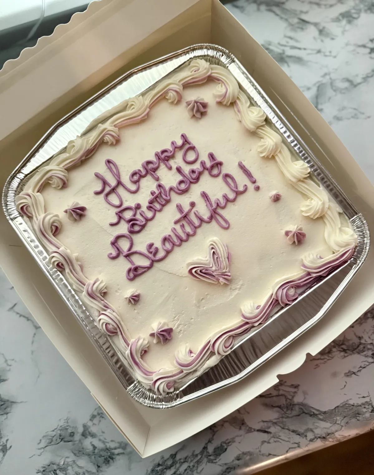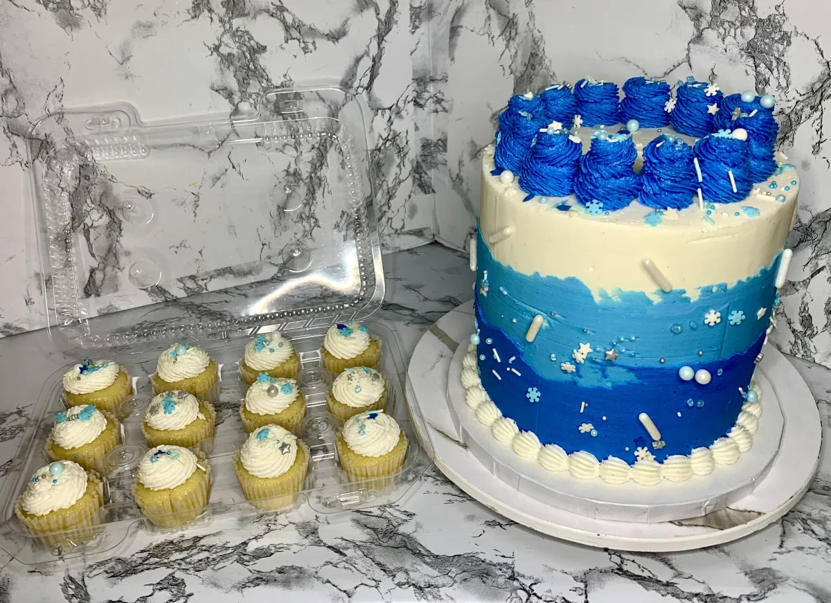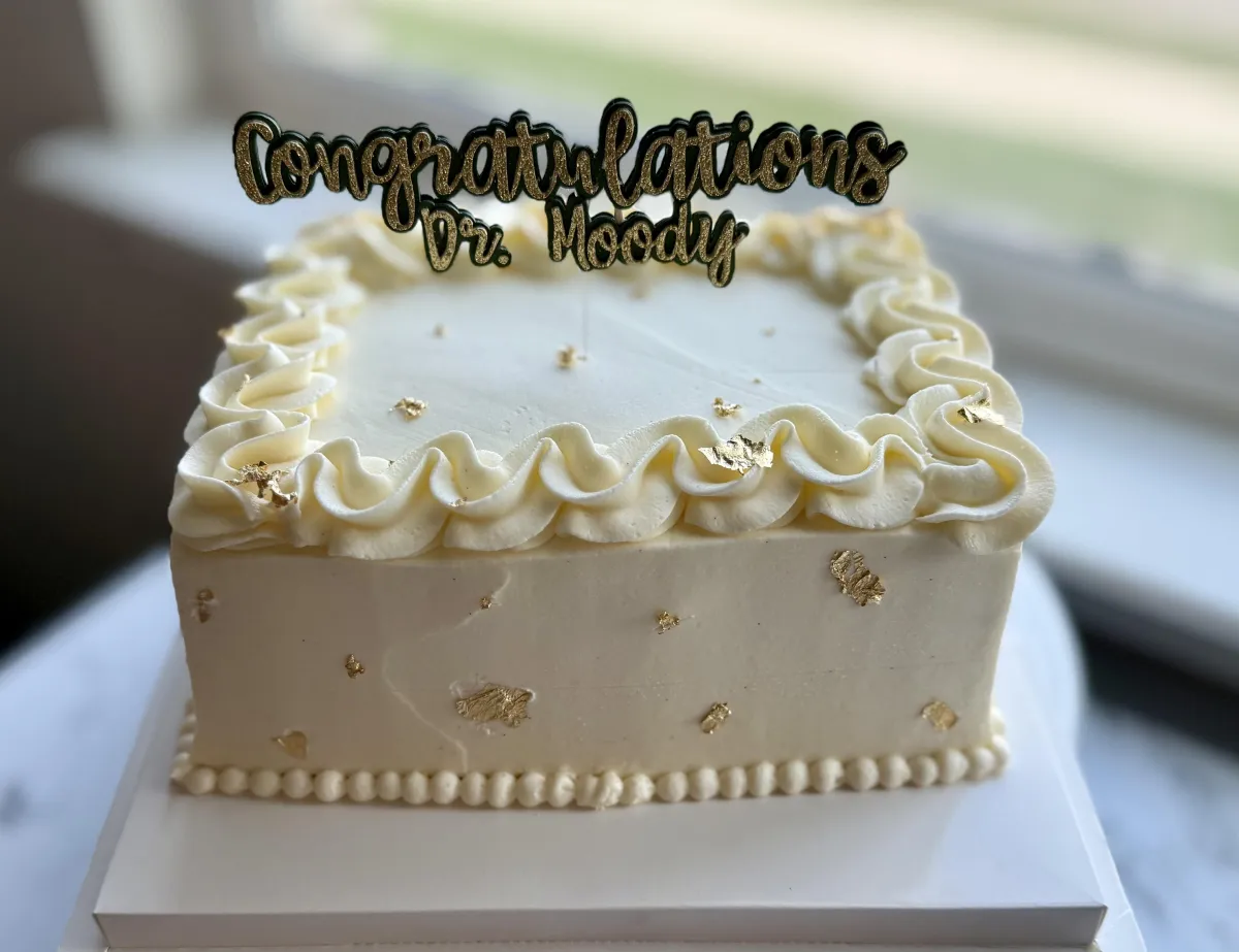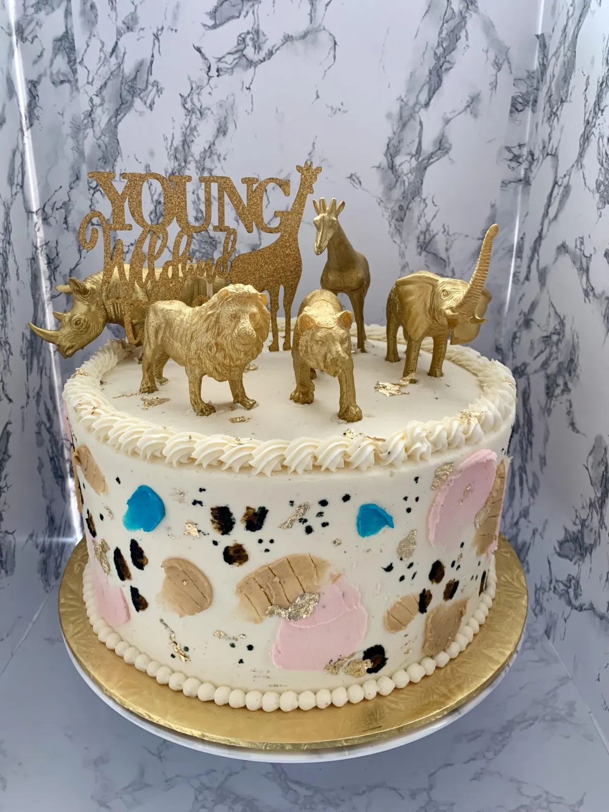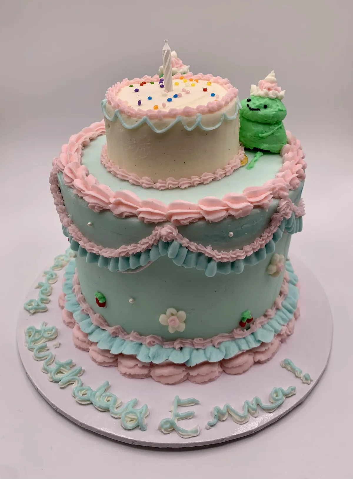 One or two layers of the cake flavour of your choice, filled and frosted with a fluffy vanilla bean buttercream.