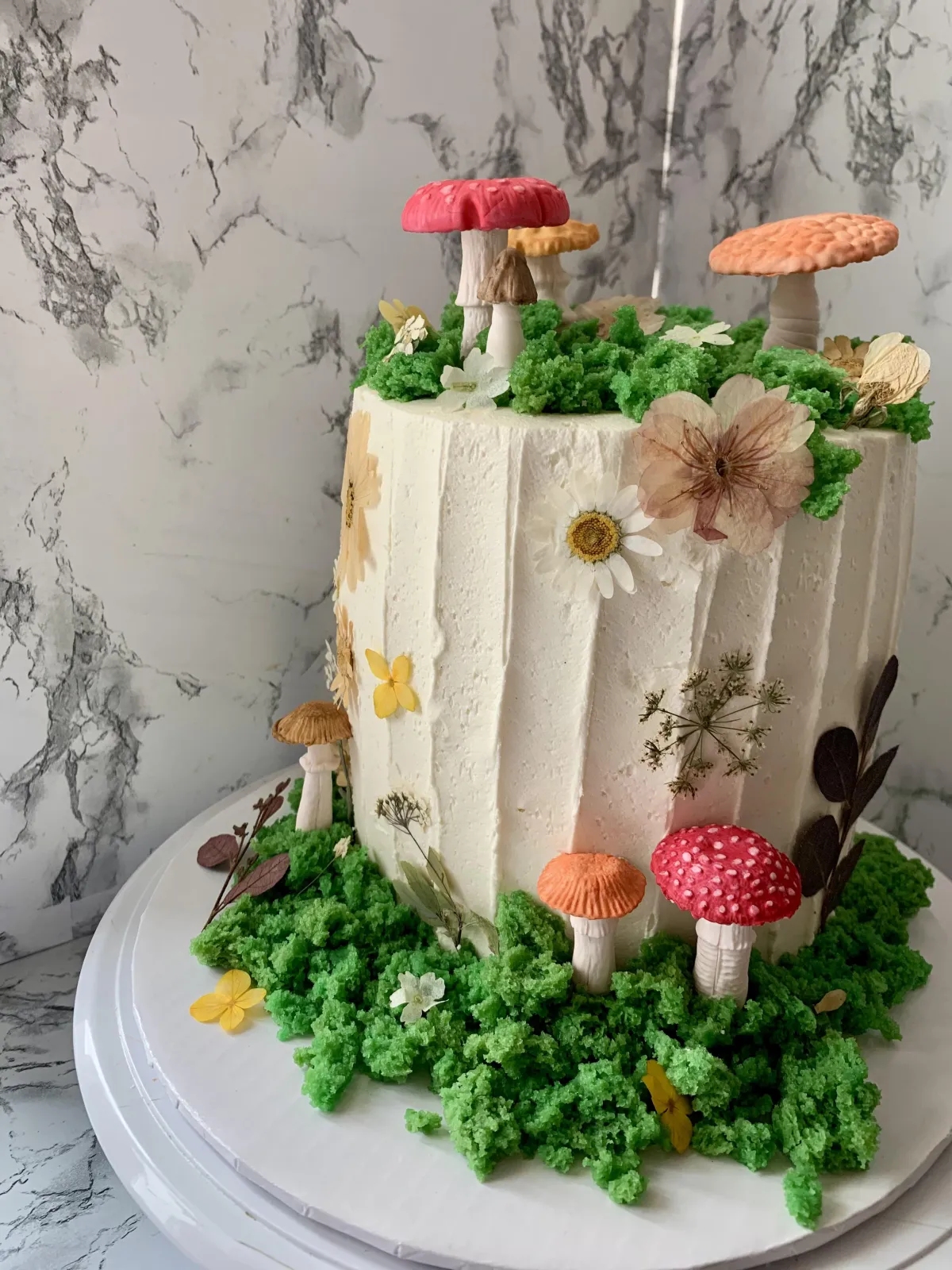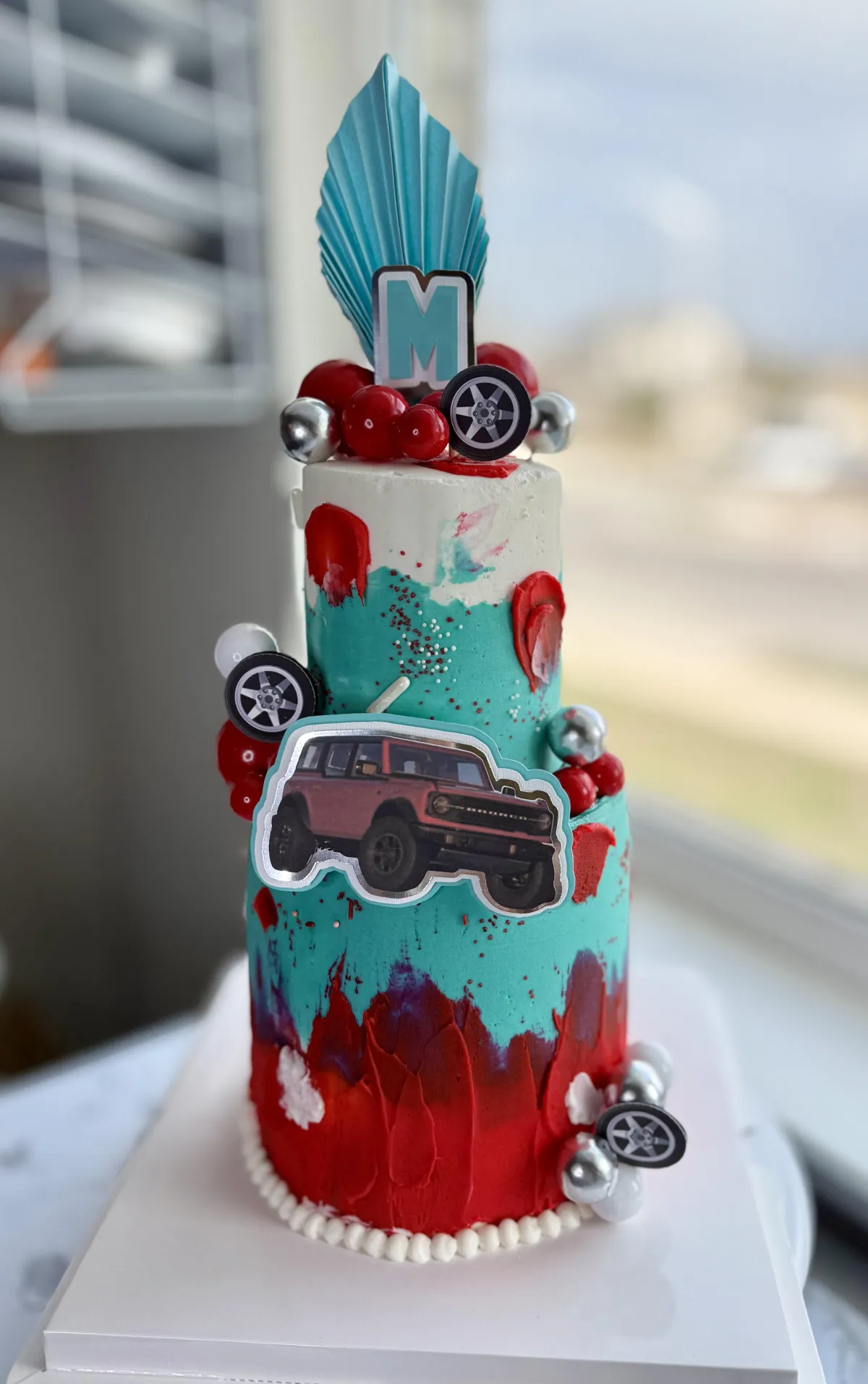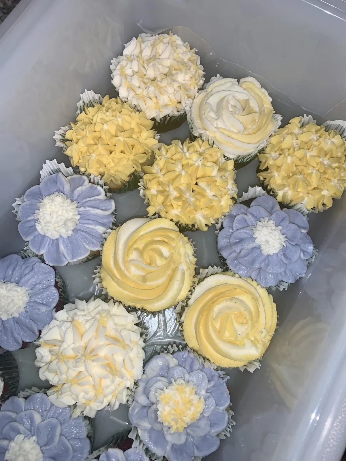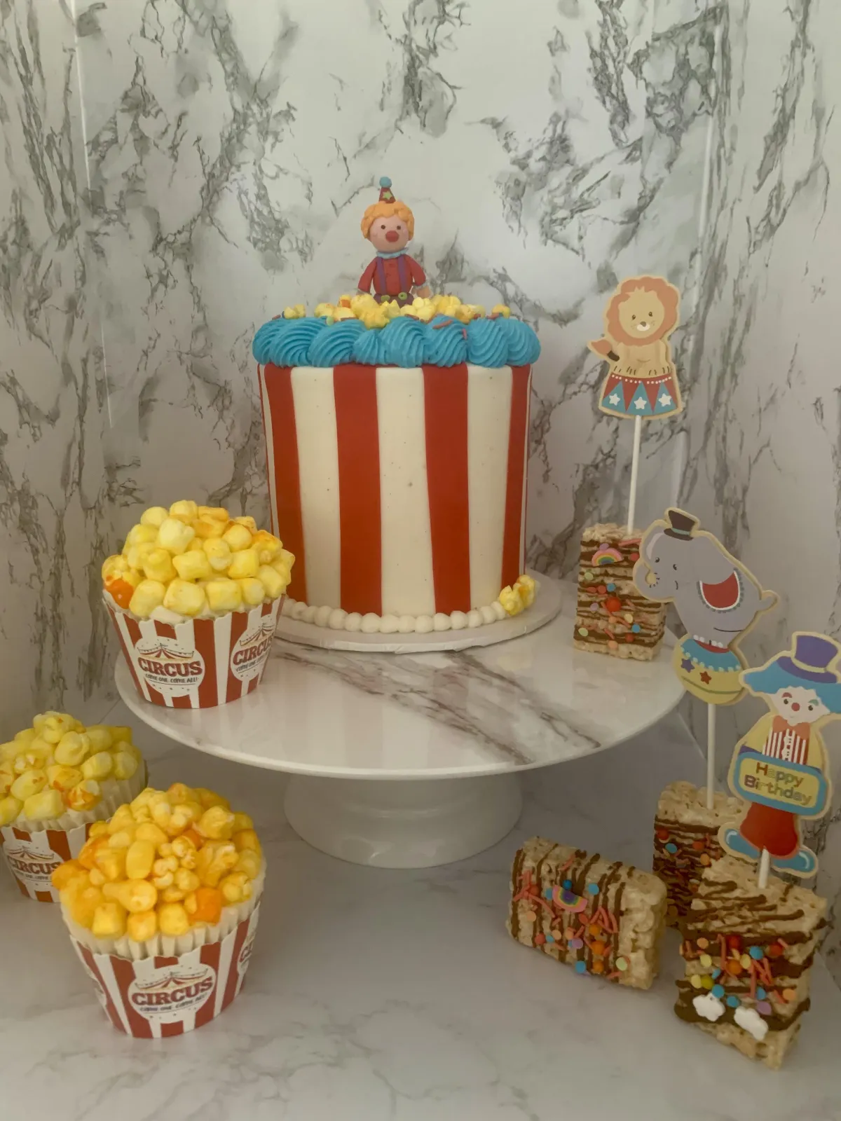 One or two layers of the cake flavour of your choice, filled and frosted with a fluffy vanilla bean buttercream.