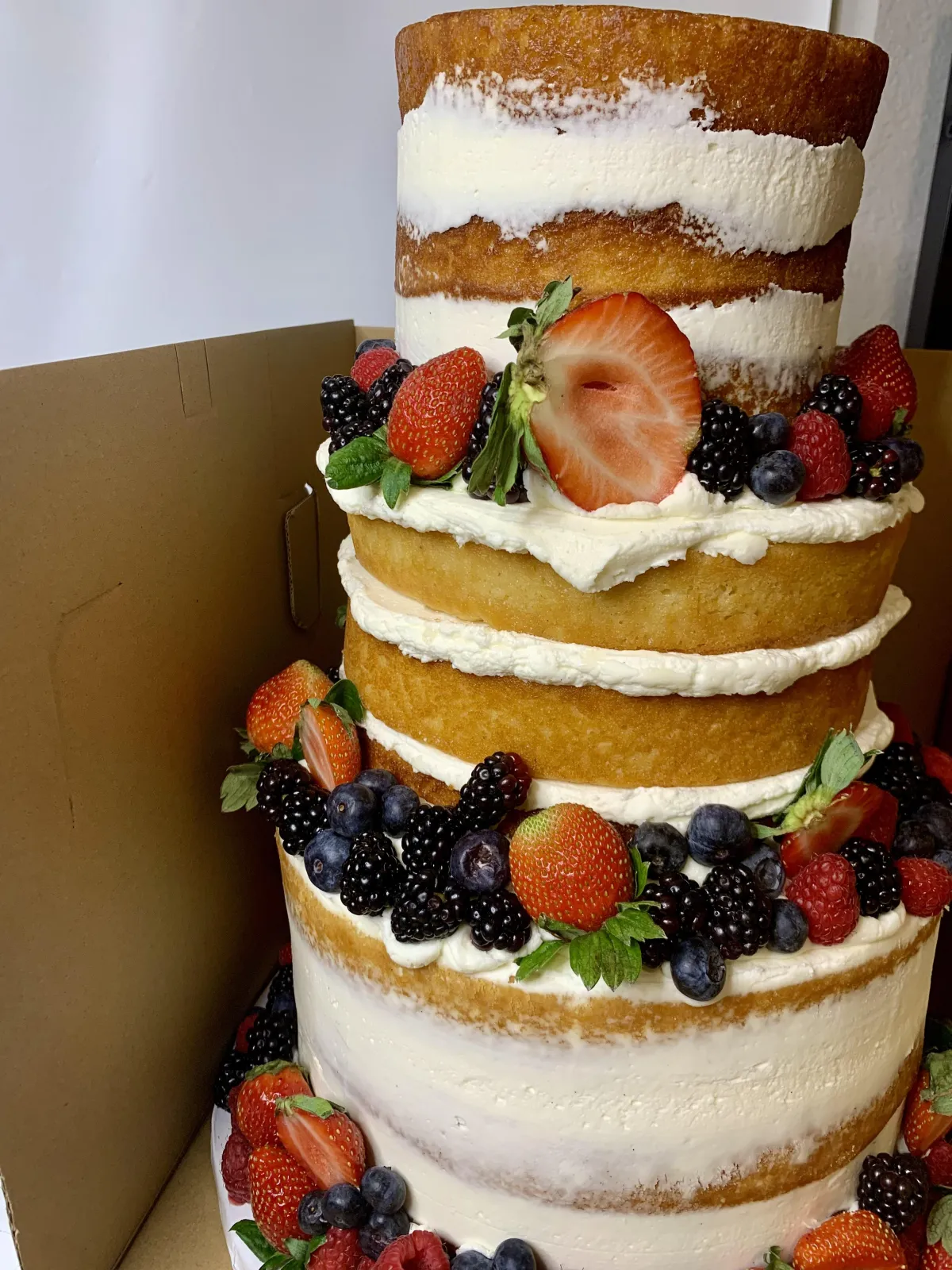 Three layers of the cake flavour of your choice, filled and frosted with a fluffy vanilla bean buttercream.